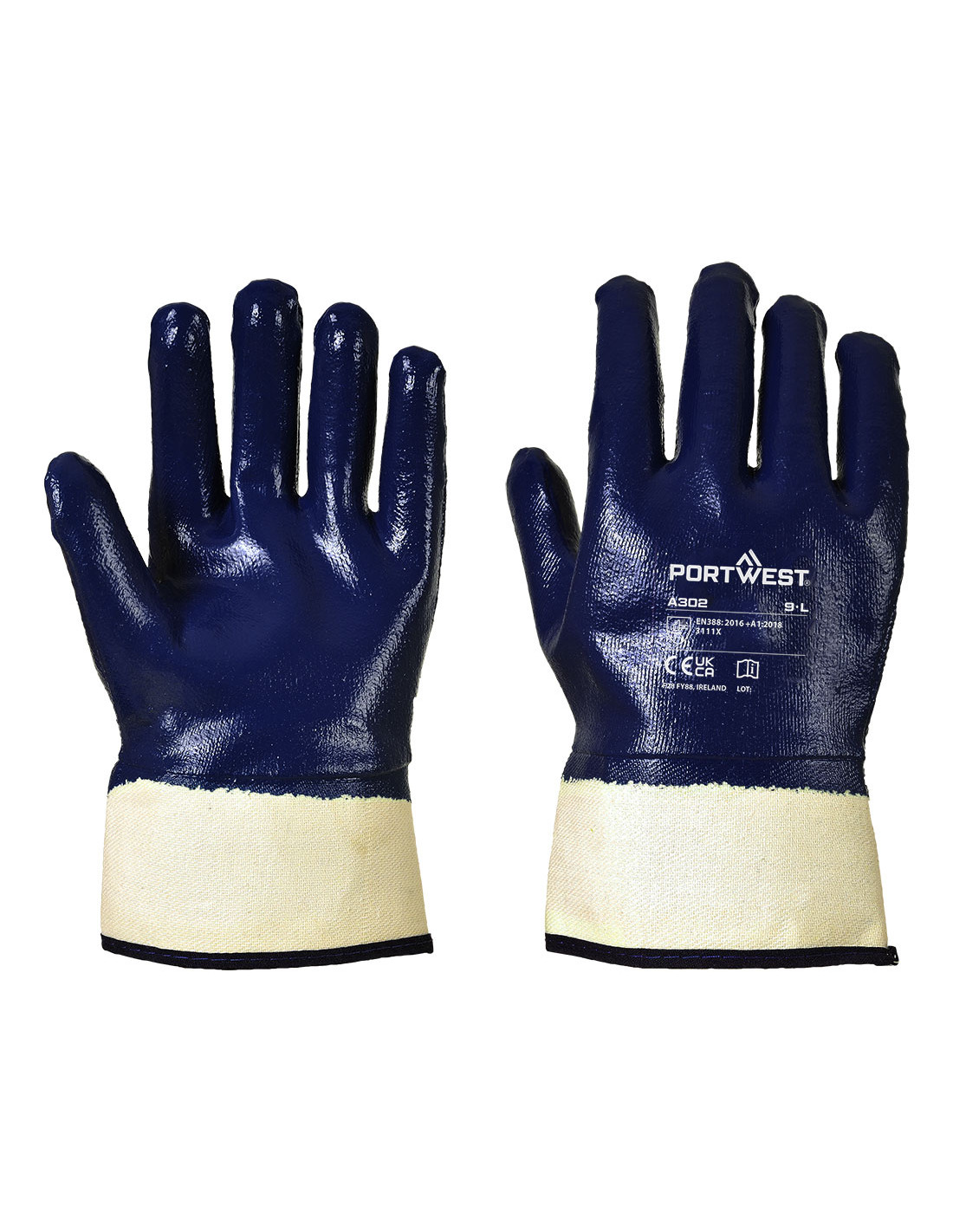 Duradera gruesa capa de nitrilo, que cubre el guante totalmente, dando mayor protección contra cortes, arañazos, pinchazos y rasgados. El manguito de seguridad permite que los guantes puedan ser quitados rápidamente de forma fácil.